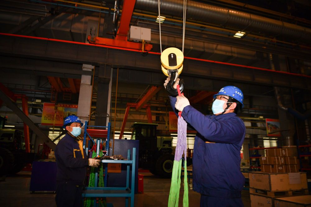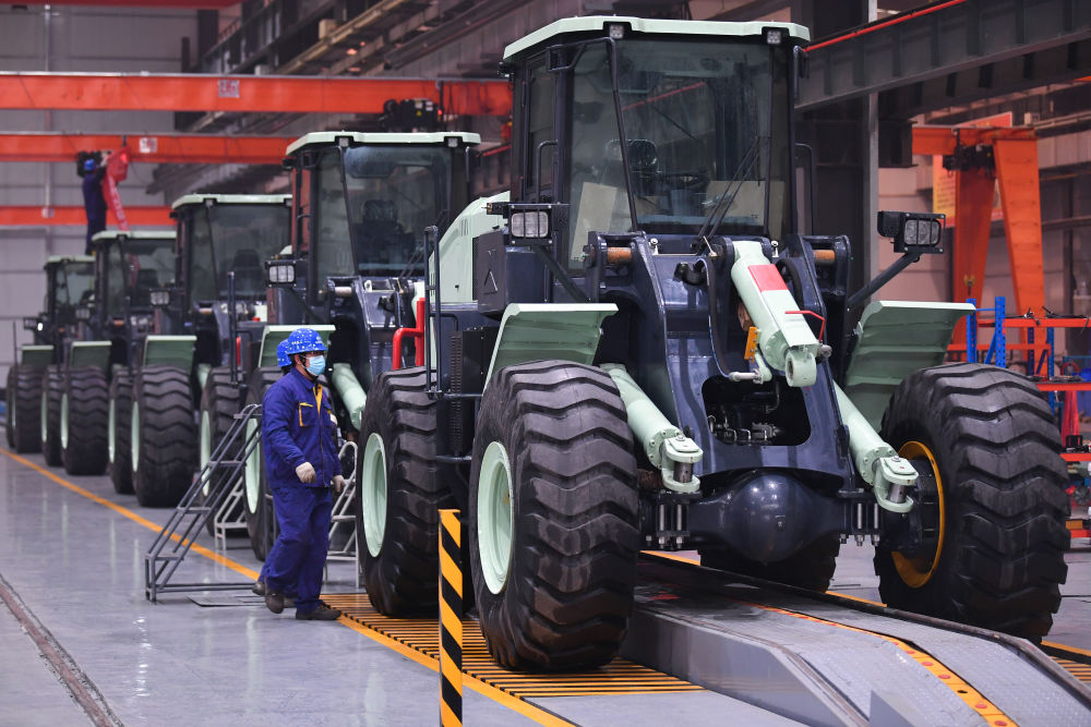 1月25日,在中鐵長安重工有限公司西安閻良生產(chǎn)基地,工人在總裝車間查看即將交付的機(jī)械設(shè)備。新華社記者 張博文 攝