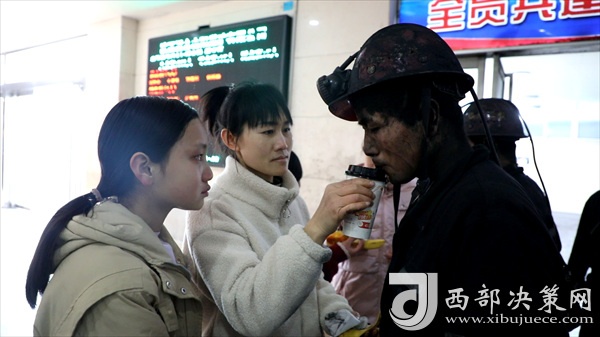 “來啦,都過來了!”“你爸在這呢”不知道哪位礦嫂喊了一聲,大家都向前擠了擠,分別在人群中找尋自己熟悉的親人,她們激動(dòng)的湊上前去,用手中的濕巾和毛巾替礦工們卸妝濃濃的“工作妝”,把手中的面包、奶茶、香蕉、蘋果送到“黑”爸爸口中??粗粡垙埡诤鹾醯哪橗?,幾乎不能辨認(rèn)的五官,家屬們有的哽咽著,有的眼淚不聽話的流下來,他們把親人的那份辛苦、那份不易看在眼里,疼在心里。
