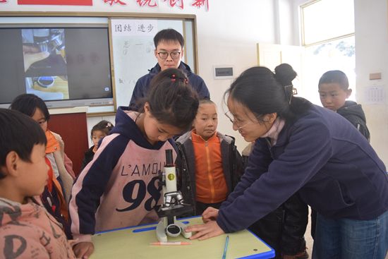 華中農業(yè)大學研支團志愿者教學生們使用顯微鏡。