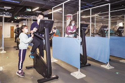 建設者代表及家屬在冬奧村體驗健身設施。