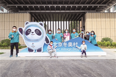 4月17日,北京冬奧村賽后首次開放,建設者代表及家屬在冬奧村合影留念。 本版攝影/新京報記者 陶冉