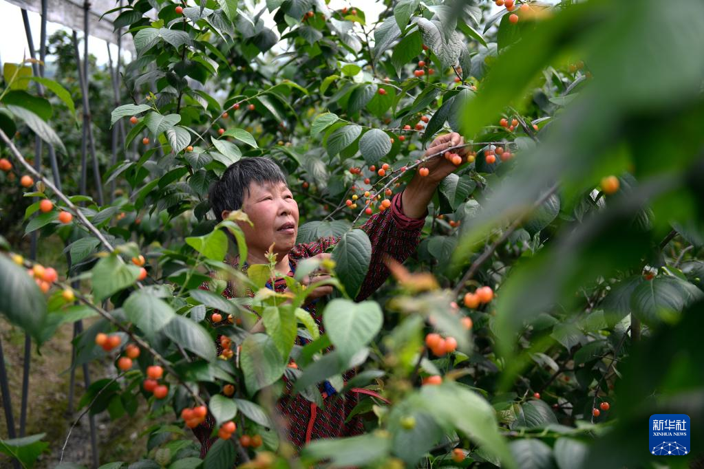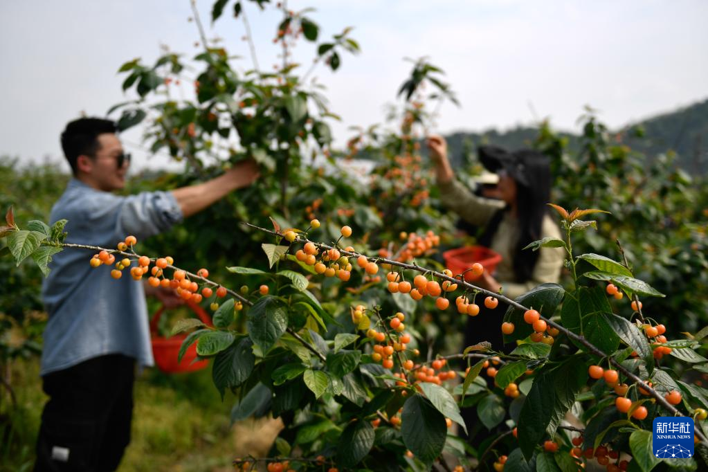 4月20日,諸暨市同山鎮(zhèn)高城頭社區(qū)的果農(nóng)在櫻桃果園采摘櫻桃。