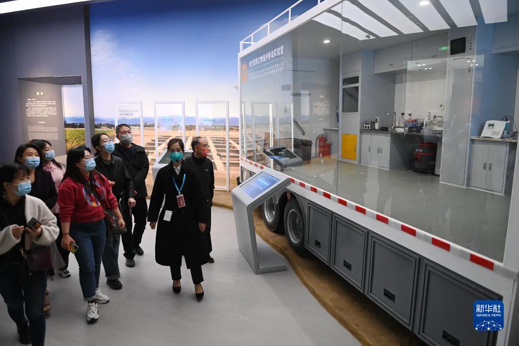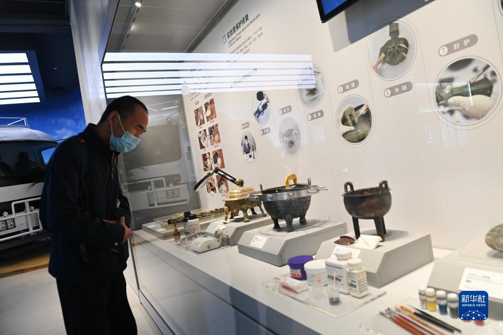 4月28日,游客在陜西考古博物館內(nèi)參觀考古現(xiàn)場文物保護移動實驗室。新華社記者 李一博 攝
