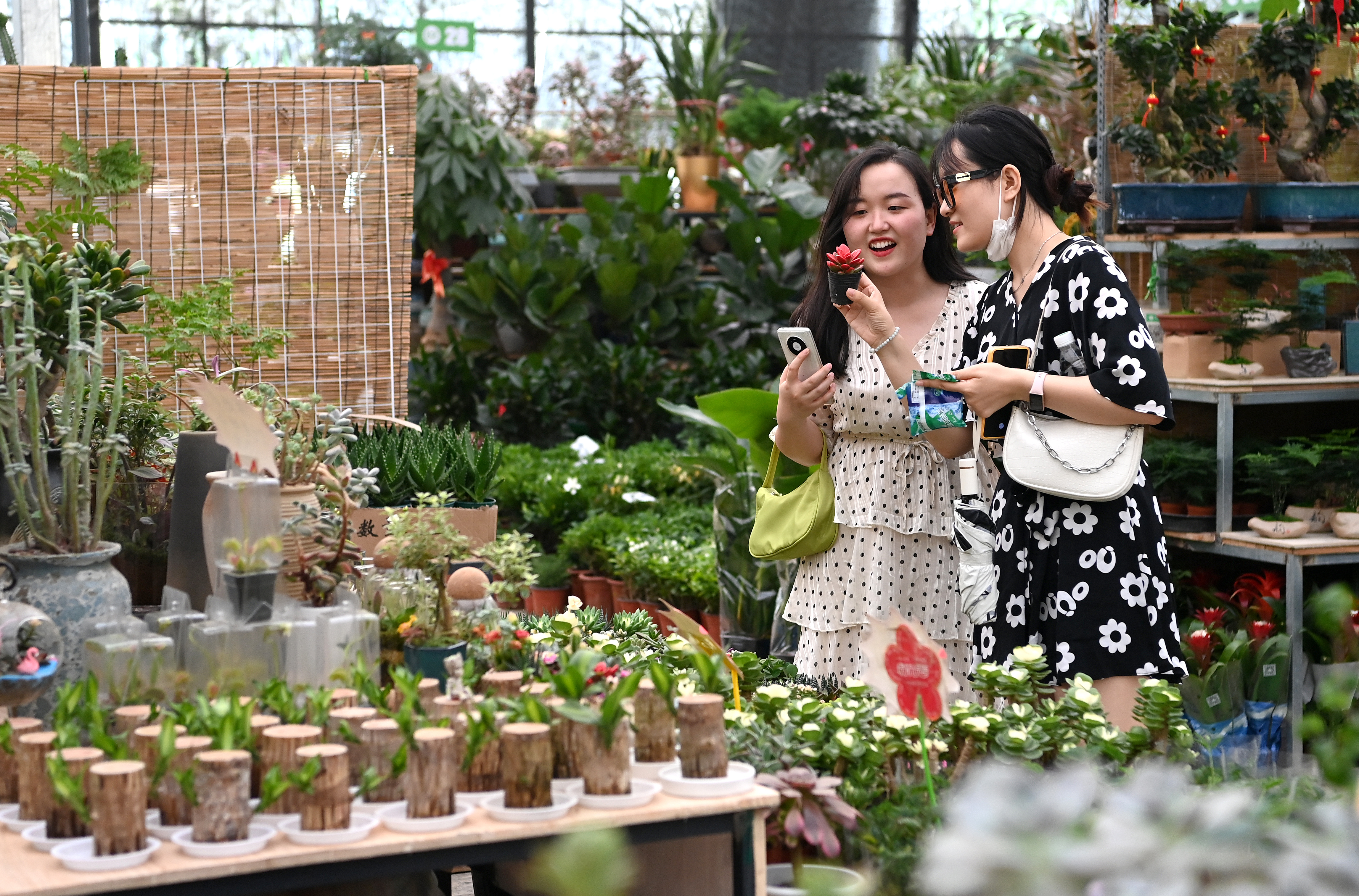 市民在西安際華3511文創(chuàng)科技園內(nèi)的花市挑選花卉(5月20日攝)。 新華社記者 劉瀟 攝