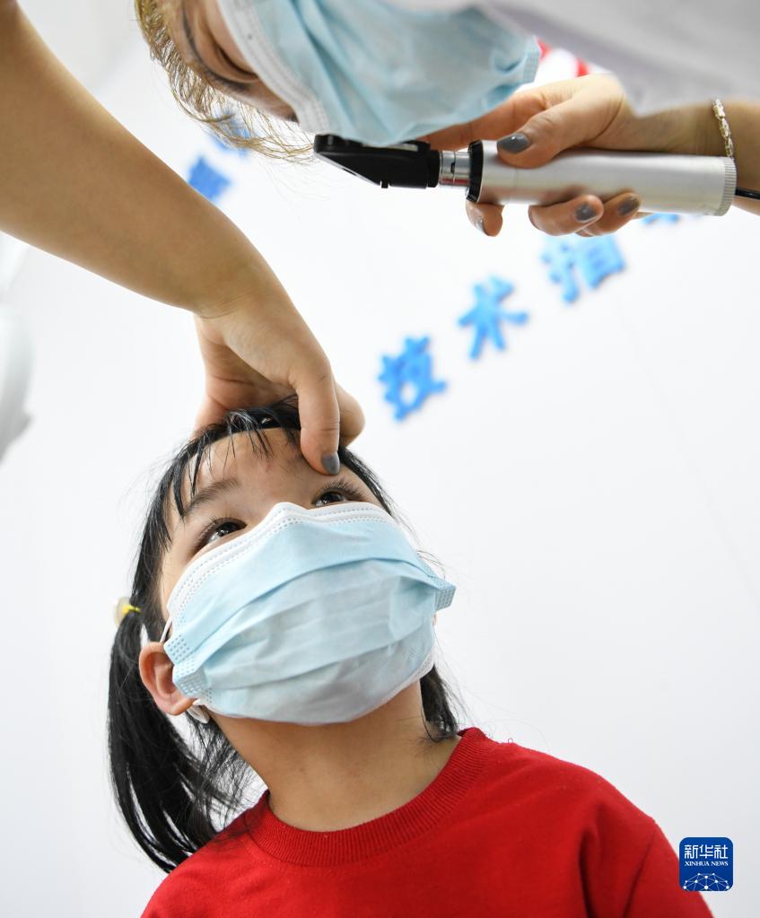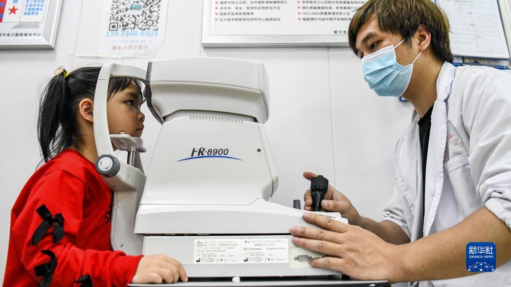 6月5日,湖南省常寧市第三人民醫(yī)院的醫(yī)護(hù)人員在為小朋友驗光。新華社發(fā)(周秀魚春 攝)