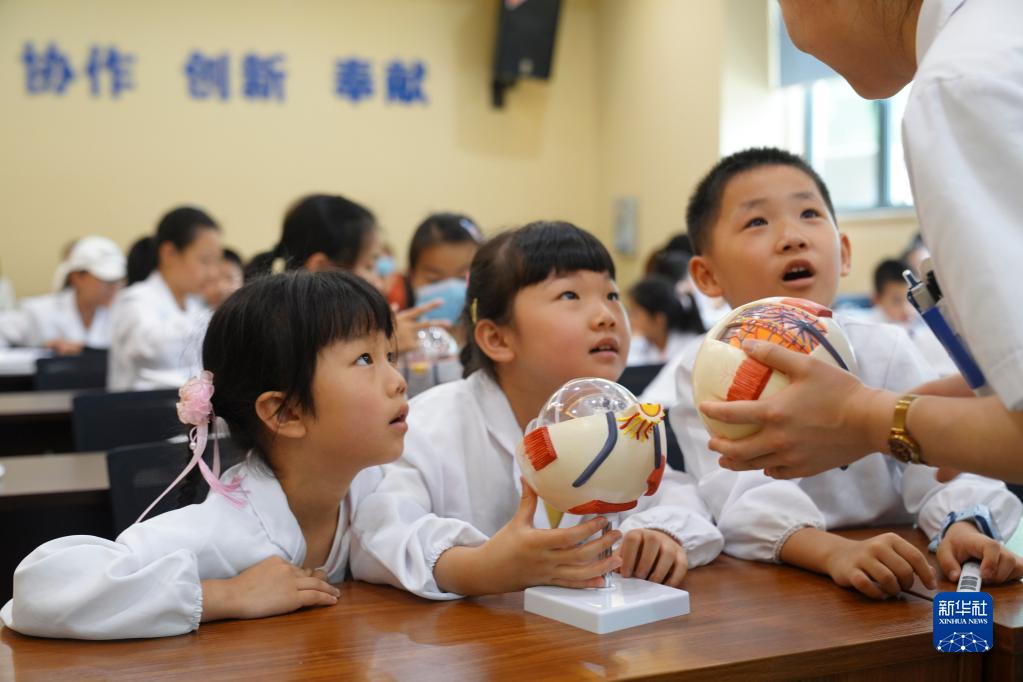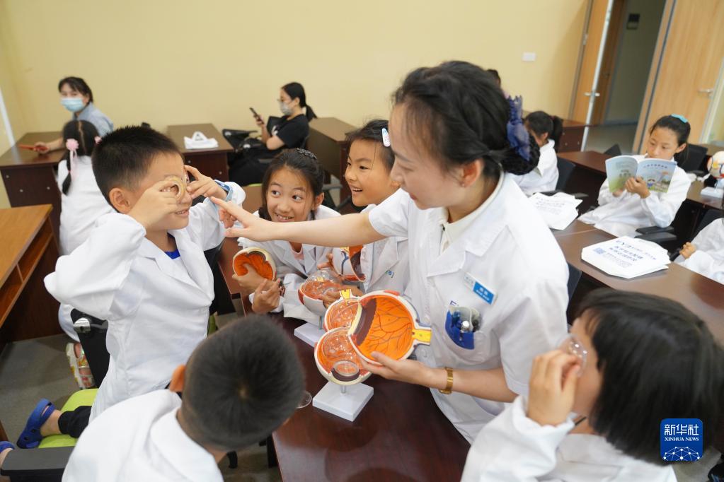 6月5日,在重慶市北碚區(qū)一家眼科醫(yī)院,一名驗光師在給孩子們講解眼球構(gòu)造知識。新華社發(fā)(秦廷富 攝)