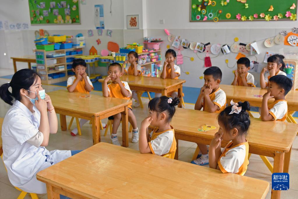 6月5日,在山東省煙臺市福山區(qū)一家幼兒園,醫(yī)務(wù)人員指導(dǎo)小朋友做眼保健操。新華社發(fā)(孫文潭 攝)