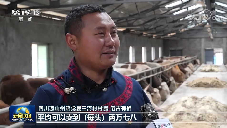 四川涼山州昭覺縣三河村村民 洛古有格:當(dāng)時(shí)總書記來(lái)的時(shí)候,我們這個(gè)養(yǎng)牛只有十幾頭。通過(guò)發(fā)展,我們?nèi)哟逵辛?000多頭這個(gè)西門塔爾牛?,F(xiàn)在我們這個(gè)牛,平均可以賣到(每頭)兩萬(wàn)七八,大的可以賣到三萬(wàn)多元,效益特別好。