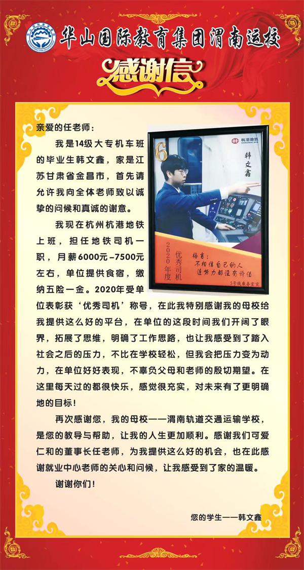 安置到杭港地鐵司機(jī)的我校優(yōu)秀畢業(yè)生韓文鑫,籍貫甘肅,月薪8000千以上