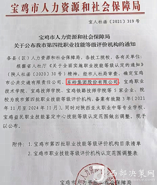 為了建立技能人才培養(yǎng)管理的長效機制,東嶺集團積極與省市人社等相關部門對接,積極創(chuàng)造內部條件,于2021年取得了“寶雞市第四批職業(yè)技能等級評價機構”認證資質,公司可以自主開展技能人才評價工作,頒發(fā)與國家職業(yè)資格證書同等效用的職業(yè)技能等級證書。取得證書后的學員,除了政府有1500元(中級)、2000元(高級)的現(xiàn)金補貼,公司也會根據(jù)實際情況提薪升職。