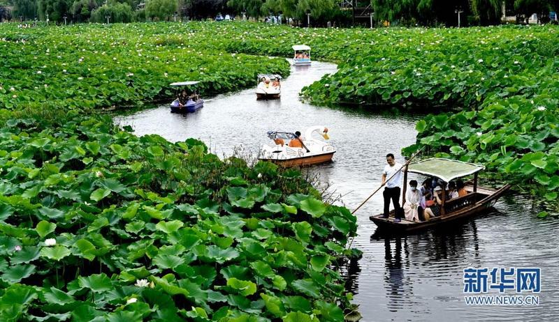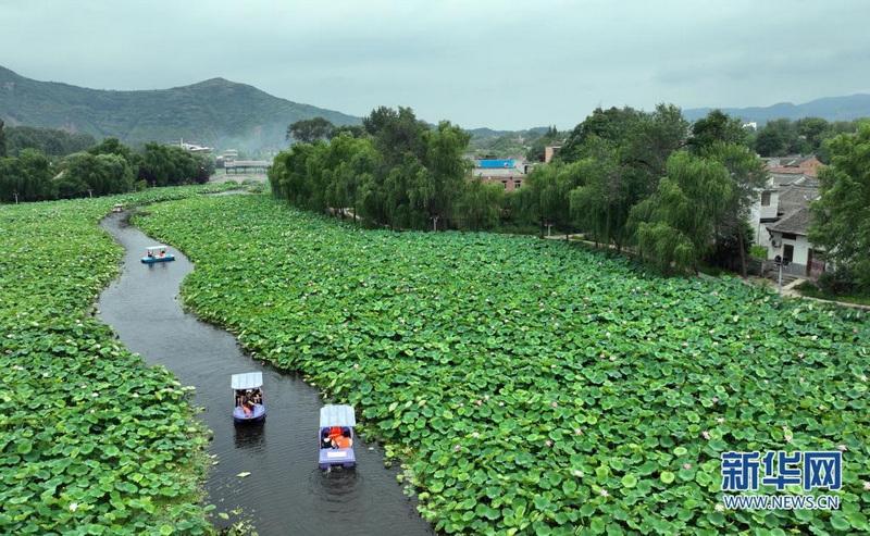 近日,秦嶺深處的陜西省商洛市丹鳳縣棣花古鎮(zhèn)荷花盛開(kāi),吸引游人前來(lái)觀賞。(記者 陶明 攝)
