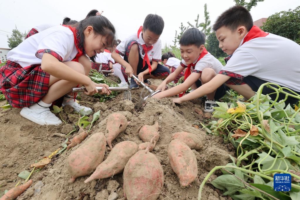 9月1日,浙江省湖州市德清縣雷甸鎮(zhèn)中心小學(xué)學(xué)生在校園農(nóng)場(chǎng)挖番薯。新華社發(fā)(謝尚國(guó) 攝)