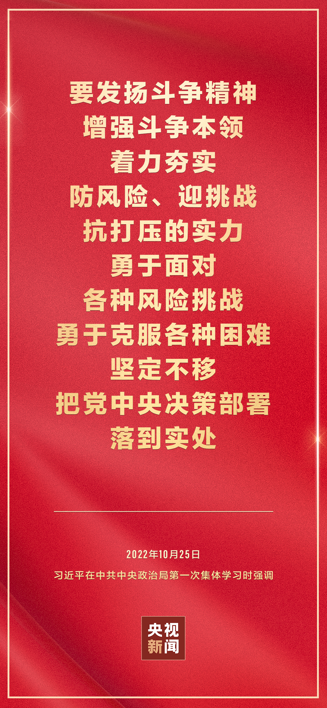 二十屆中共中央政治局10月25日下午就學(xué)習(xí)貫徹黨的二十大精神進(jìn)行第一次集體學(xué)習(xí)。中共中央總書(shū)記習(xí)近平在主持學(xué)習(xí)時(shí)強(qiáng)調(diào),全黨要在全面學(xué)習(xí)、全面把握、全面落實(shí)上下功夫,堅(jiān)定不移把黨的二十大提出的目標(biāo)任務(wù)落到實(shí)處,奮力奪取全面建設(shè)社會(huì)主義現(xiàn)代化國(guó)家新勝利。