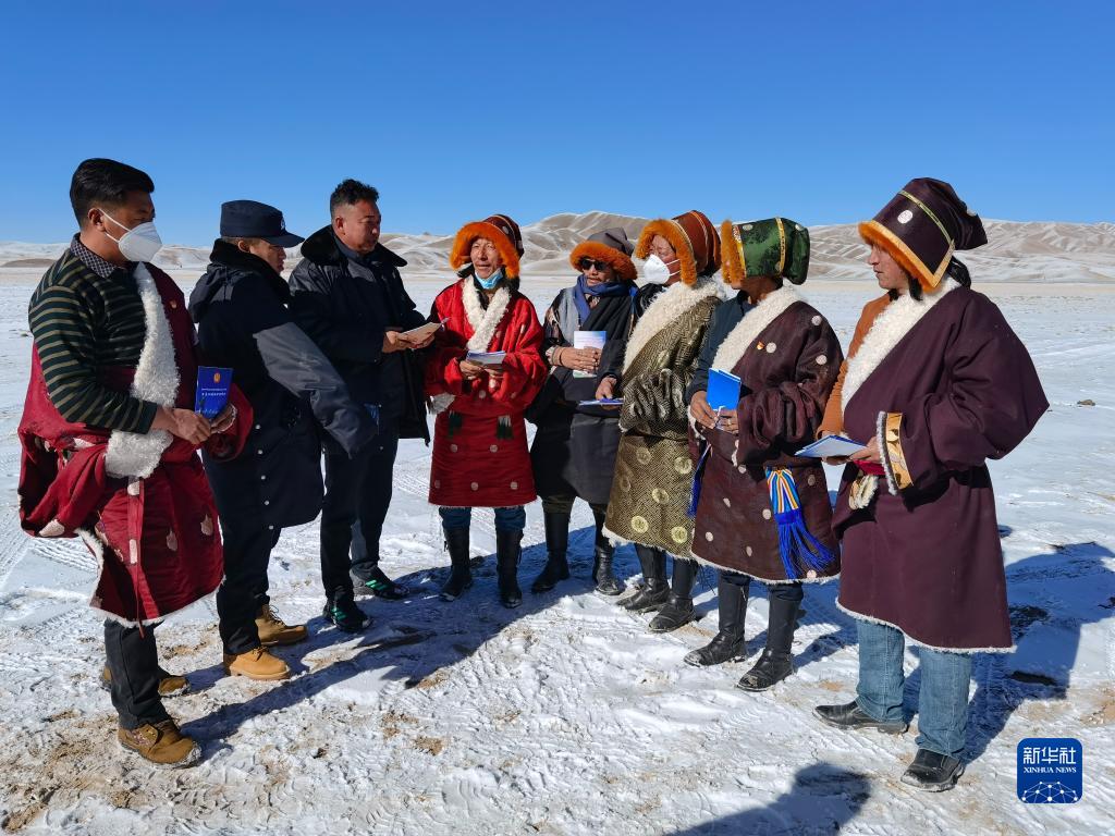2021年12月20日,瑪多縣人民法院院長錢快乾(左一)給當地牧區(qū)群眾宣講法律知識。新華社發(fā)