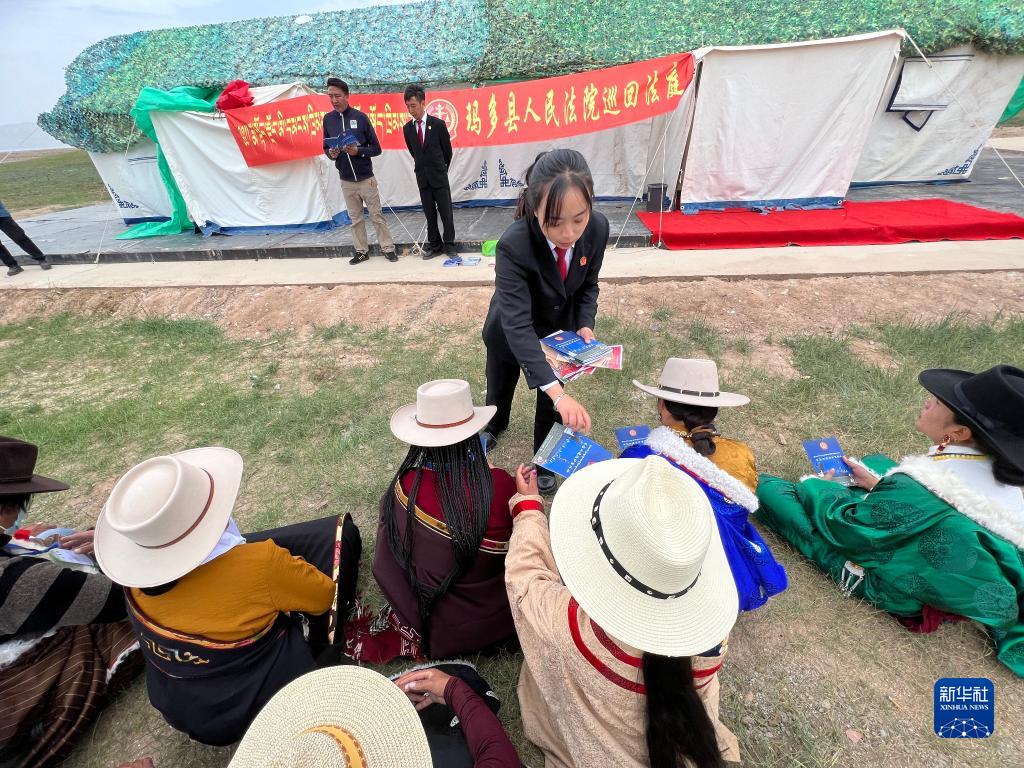 2022年7月14日,在瑪多縣花石峽鎮(zhèn),瑪多縣人民法院法官在審理案件。新華社發(fā)