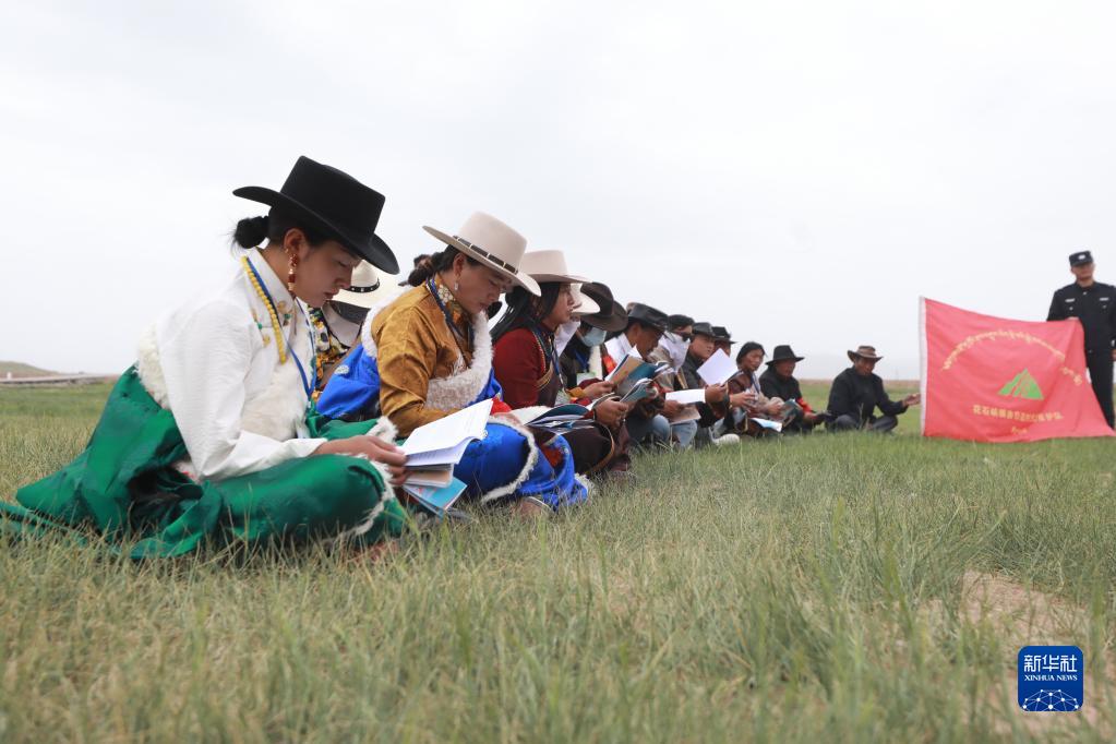 2022年7月12日,在瑪多縣花石峽鎮(zhèn)吉日邁村,瑪多縣人民法院立案庭庭長才偵措(中)在開展環(huán)境保護相關法律宣傳。新華社發(fā)