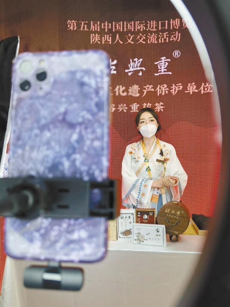 進博會期間,身著古裝的工作人員為裕興重茯茶進行直播帶貨。
