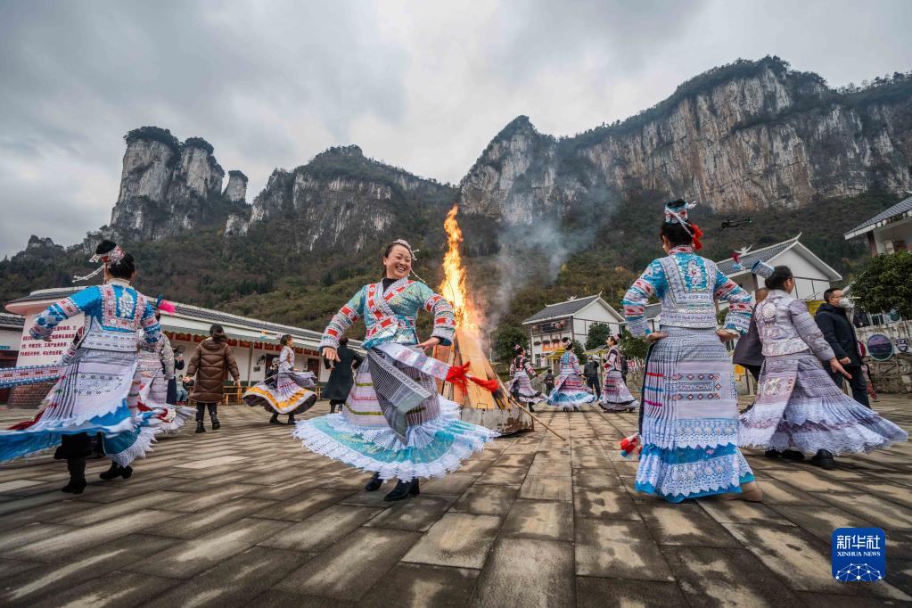 1月2日,游客在貴州省黔西市新仁苗族鄉(xiāng)化屋村和苗族同胞一起圍著篝火跳舞。新華社發(fā)(羅大富 攝)
