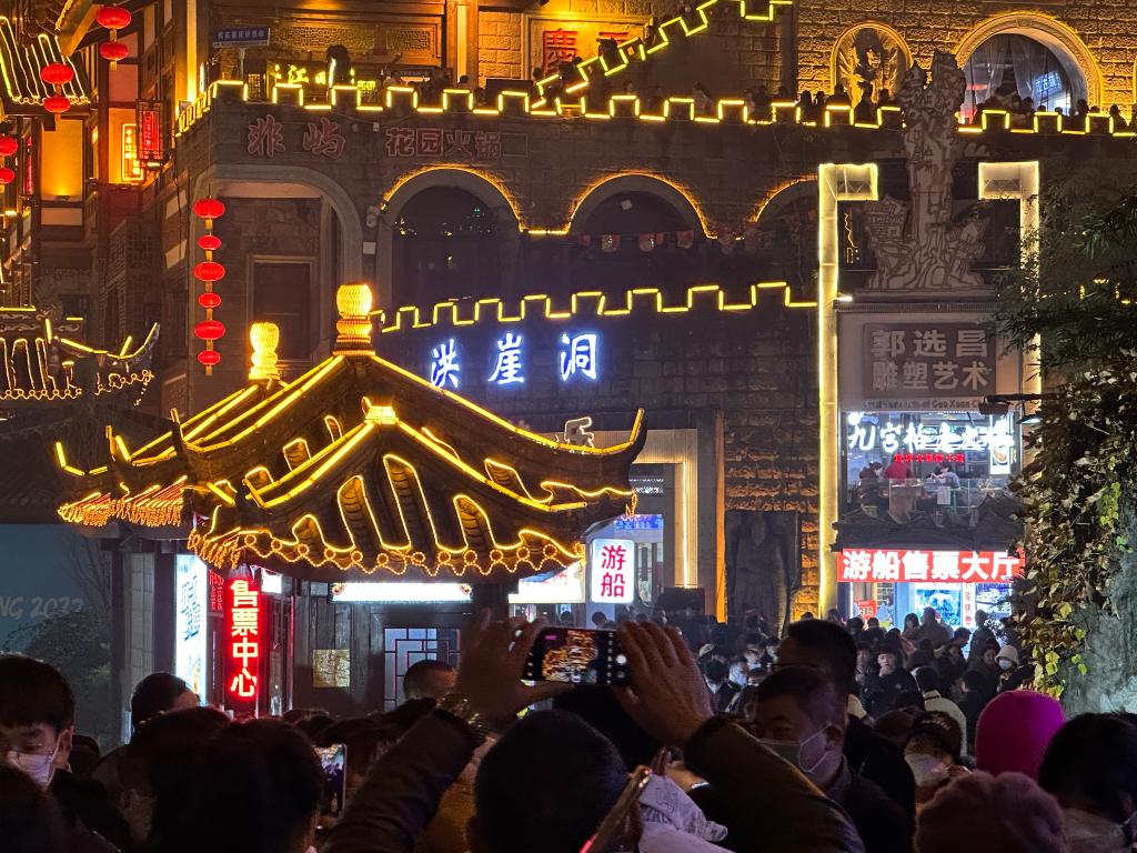重慶洪崖洞民俗風(fēng)貌區(qū)重現(xiàn)歡鬧,“店鋪營(yíng)業(yè)額同比增長(zhǎng)20%。”一家火鍋店店主陳大江說;重慶老街山城巷,紅燈籠照亮青石與黛瓦,人們?cè)诖蚩ǖ嘏抨?duì)拍照。“這里古色古香,又融入現(xiàn)代時(shí)尚元素,很有氛圍!”游客秦藝說。