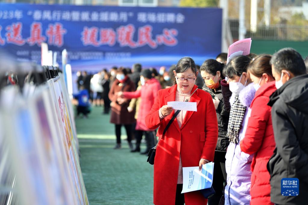 1月31日,求職者在湖北省襄陽市??悼h2023年春風(fēng)行動暨就業(yè)援助月現(xiàn)場招聘會上了解崗位信息。新華社發(fā)(楊韜攝)