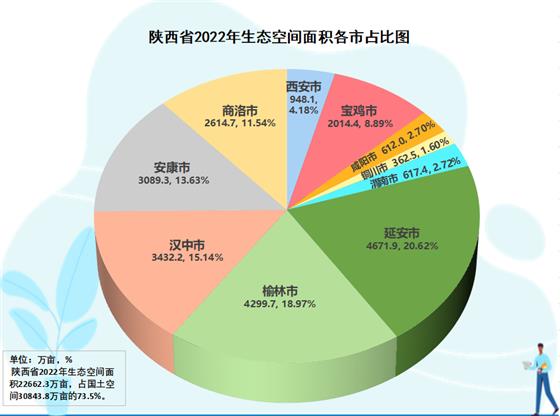 陜西南部秦巴山脈、北部黃土高原、中部渭河川地,自然生態(tài)空間多、占比大。陜西省生態(tài)空間數據中心提供的數據顯示,全省國土空間3.08億畝,其中生態(tài)空間(林地、草地、濕地、荒野)2.26億畝。從全省10市生態(tài)空間大格局分析觀察,黃土高原腹地的延安是全省生態(tài)空間第一市,生態(tài)空間4671.9萬畝、占本市國土空間84.1%、占全省生態(tài)空間20.6%。長城內外、林草過度的榆林居第二,生態(tài)空間4299.7萬畝、占本市國土空間66.8%、占全省生態(tài)空間19.0%。第三是漢中,生態(tài)空間3432.2萬畝、占本市國土空間84.4%、占全省生態(tài)空間15.1%。第四是安康,生態(tài)空間3089.3萬畝、占本市國土空間87.5%、占全省生態(tài)空間13.6%。其后,依次分別是商洛,生態(tài)空間2614.7萬畝、占本市國土空間90.0%、占全省生態(tài)空間11.5%,寶雞2014.4萬畝、占本市74.1%、占全省8.9%,西安948.1萬畝、占本市62.6%、占全省4.2%,渭南617.4萬畝、占本市31.5%、占全省2.7%,咸陽612萬畝、占本市39.5%、占全省2.7%,銅川362.5萬畝、占本市62.2%、占全省1.6%。