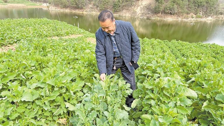 3月1日,周應(yīng)軍在漢中市南鄭區(qū)的制種田查看油菜生長(zhǎng)情況。 記者 趙茁軼攝