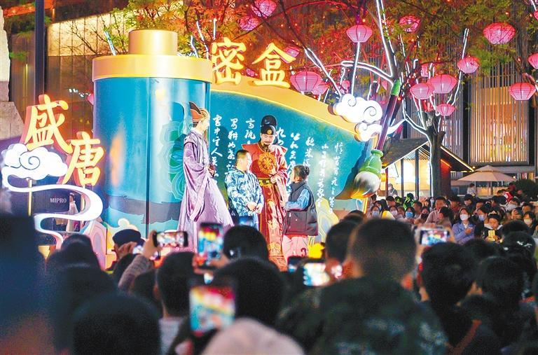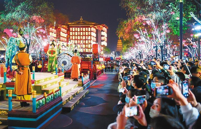 文化為旅游賦能,旅游因文化而有了靈魂。如果說(shuō)大唐不夜城是西安盛唐文化的名片,那么大唐不夜城的演出則把盛唐文化真切地呈現(xiàn)在了人們的面前?!赌奚延鹨挛琛肥鞘⑻谱钊A麗的舞蹈,《花車(chē)斗彩》展示了大唐風(fēng)采,《盛唐密盒》把生活過(guò)成了段子,《華燈太白》凝結(jié)了李白的詩(shī)情與不羈,“不倒翁小姐姐”巧笑倩兮,搖出了長(zhǎng)安女子的溫柔……