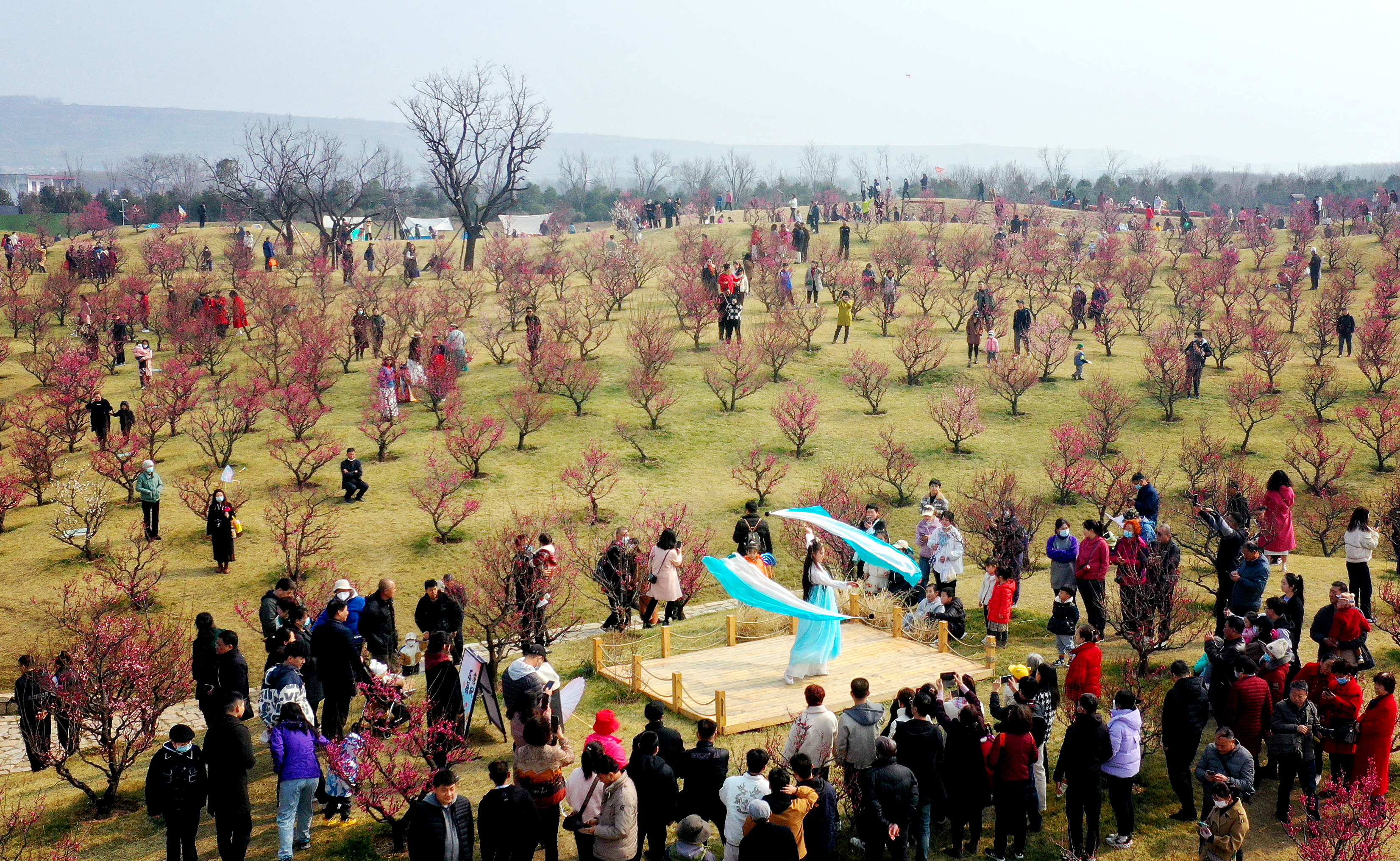 2月26日,游人在長安唐村梅園內(nèi)賞梅(無人機(jī)照片)。新華社記者 劉瀟 攝