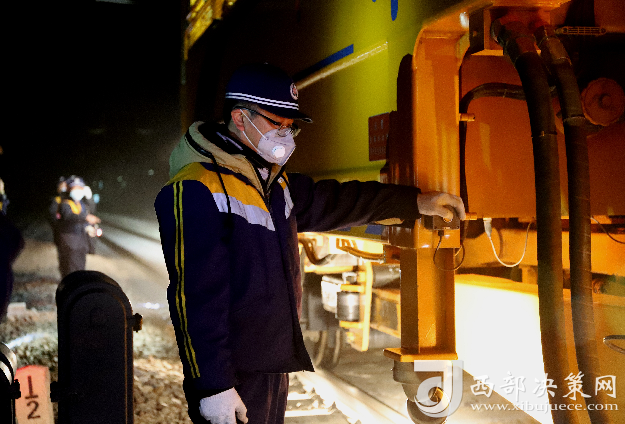 深夜,在柳家臺至古浪區(qū)間的兩臺線路搗固車發(fā)出震耳的轟鳴聲,打破了周圍的寂靜,搗固單元強(qiáng)有力的下插到道床深處。作業(yè)車輛的燈光點(diǎn)綴著夜空,黃色,紅色的燈光交織相錯(cuò),猶如一副深夜壯麗施工圖。在車下負(fù)責(zé)監(jiān)控的操作人員李偉一會握緊拳頭,一會揮動手臂和車內(nèi)操作人員進(jìn)行聯(lián)控操作,確保搗固單元準(zhǔn)確無誤的密實(shí)道床,提高線路道床的穩(wěn)定性。