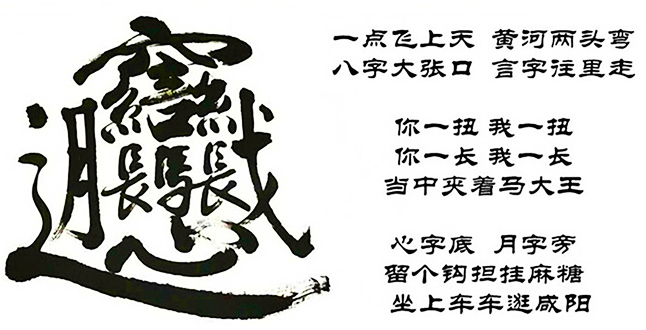 可“biang”字怎么寫?秀才拿出筆墨,寫出了以下口訣:一點(diǎn)飛上天,黃河兩邊彎;八字大張口,言字往里走,左一扭,右一扭;西一長(zhǎng),東一長(zhǎng),中間加個(gè)馬大王;心字底,月字旁,留個(gè)勾搭掛麻糖;推個(gè)車車逛咸陽(yáng)。于是就有了今天的“biang”字。