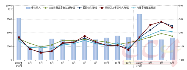 國家統(tǒng)計局6月15日發(fā)布的5月份國民經(jīng)濟運行數(shù)據(jù)顯示,2023年5月份,全國餐飲收入4070億元,同比上升35.1%;限額以上單位餐飲收入1084億元,同比上升31.4%。2023年1-5月,全國餐飲收入19958億元,同比上升22.6%;限額以上單位餐飲收入5086億元,同比上升25.4%。