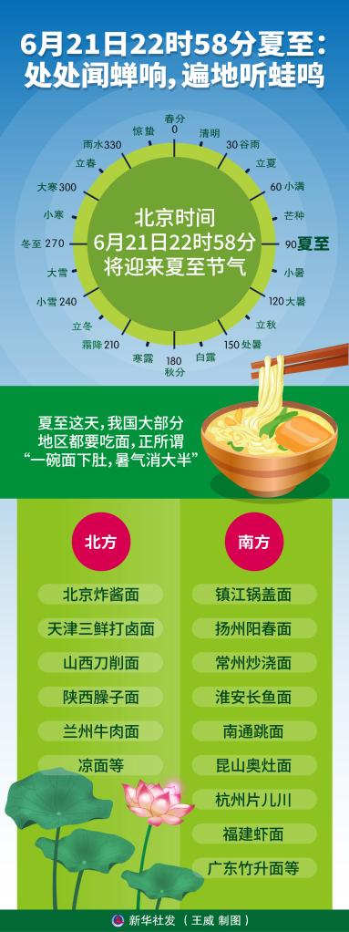 新華社天津6月20日電(記者周潤?。?ldquo;綠筠尚含粉,圓荷始散芳”。北京時(shí)間6月21日22時(shí)58分將迎來夏至節(jié)氣,標(biāo)志著蛙鳴陣陣、蟬吟聲聲、荷韻飄香的盛夏來臨了。