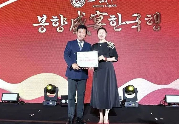 自進(jìn)入韓國市場以來,西鳳酒以大氣雅致的包裝、卓越優(yōu)秀的品質(zhì)、醇香甘美的口感贏得了廣大消費(fèi)者的喜愛,銷售業(yè)績連年翻倍增長,并連續(xù)兩年榮獲“韓國酒類鑒賞大賽”特等獎及“Best of 2023”大獎。會上,陜西西鳳酒股份有限公司副總經(jīng)理、營銷公司總經(jīng)理周艷花為韓國華岡酒業(yè)株式會社頒發(fā)“海外拓展獎”,對金嵐洙社長及其團(tuán)隊為西鳳酒市場拓展所做出的的努力表示感謝。