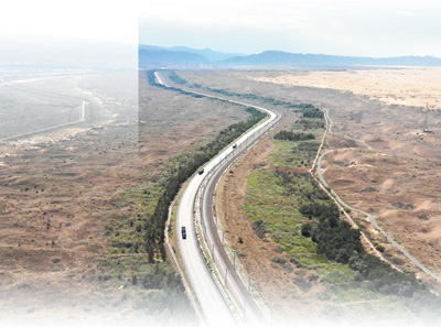 從1950年至1985年,經過幾代治沙者不斷探索,在包蘭鐵路經過騰格里沙漠東南邊緣的55公里、兩側各500米范圍內,逐步構筑了“卵石防火帶、灌溉造林帶、草障植物帶、前沿阻沙帶和封沙育草帶”的治沙防護體系。