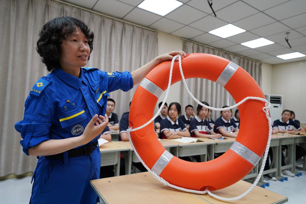 河北邢臺(tái)藍(lán)天救援隊(duì)志愿者指導(dǎo)邢臺(tái)市第八中學(xué)學(xué)生使用救生圈。 新華社記者駱學(xué)峰 攝