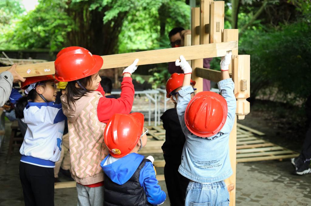 2023年4月22日,在成都市溫江區(qū)陳家桅桿建筑群,孩子們正在搭建川西古建模型。(嚴浩 攝)