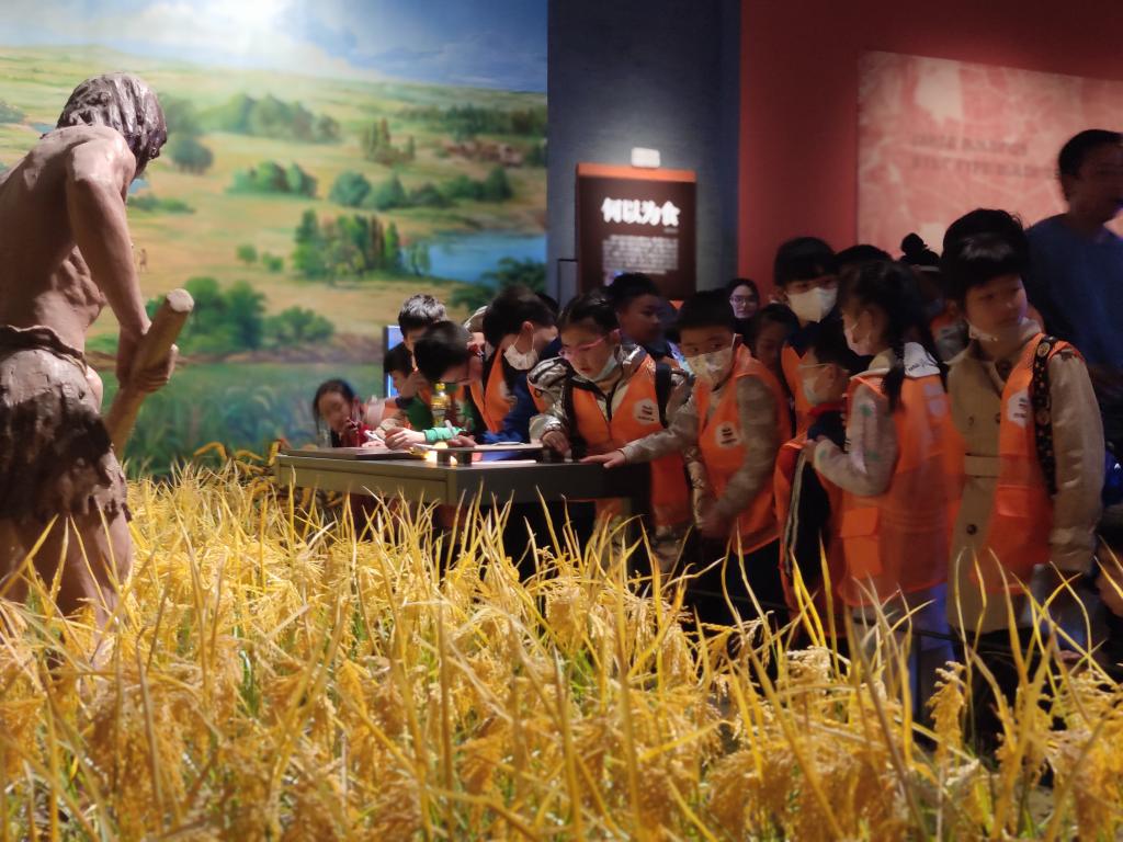 2023年3月,在新津?qū)毝者z址展廳,孩子們在參觀4500年前的碳化水稻。(陳煒森 攝)