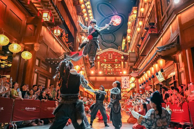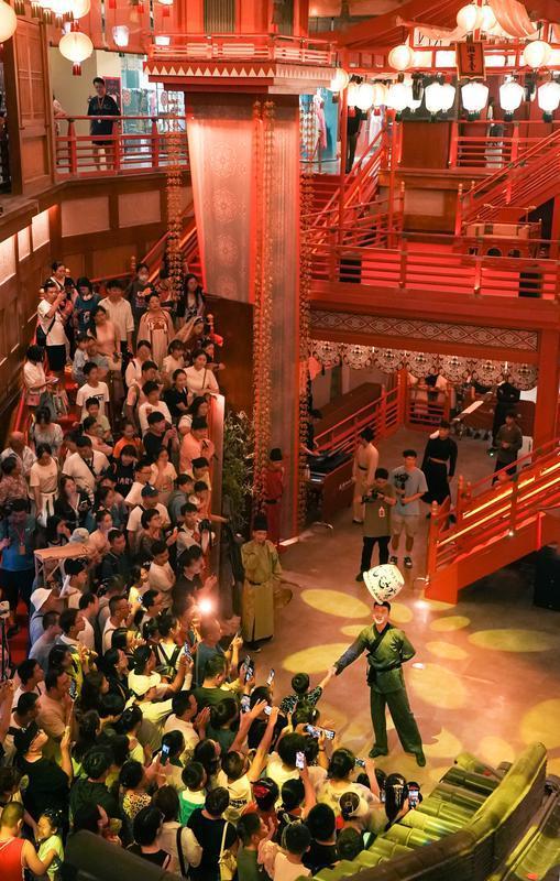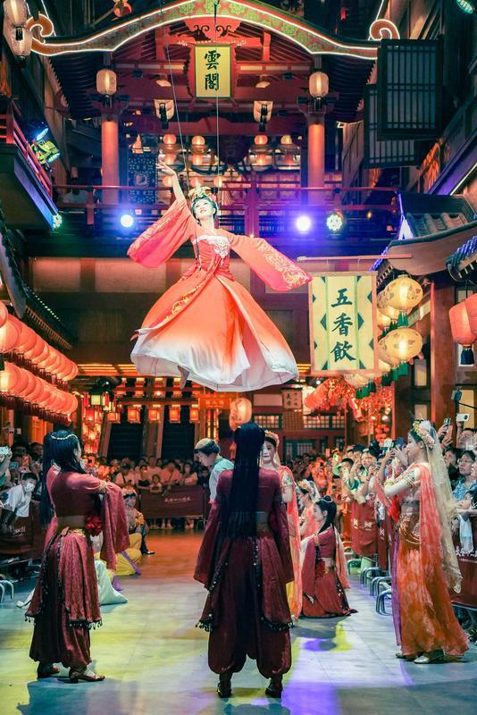 新增節(jié)目《萬邦來朝》包含胡旋舞、走秀、雜技等表演,熱鬧非凡。圖為演員表演雜技。