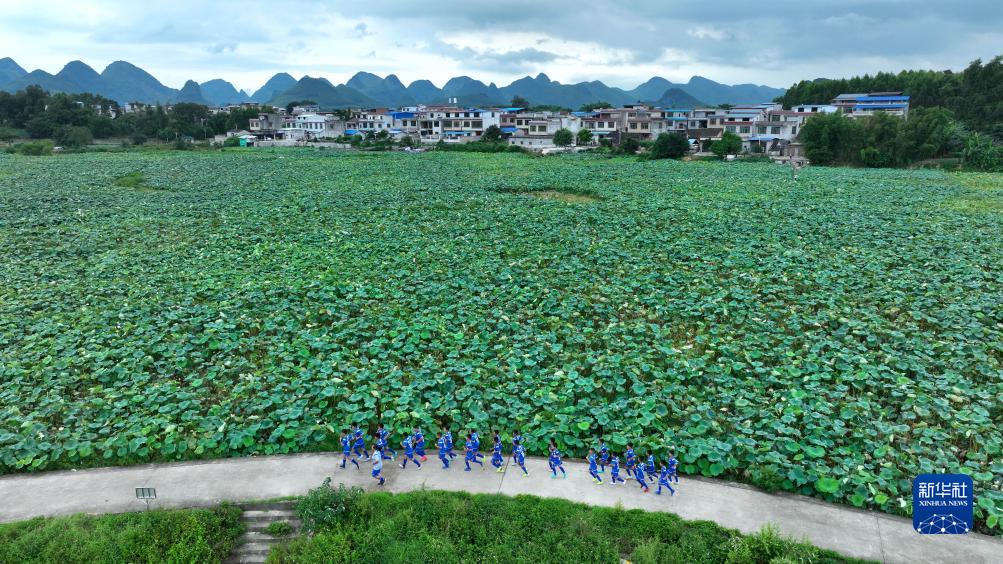 8月7日傍晚,孩子們?cè)诤商吝吪懿藉憻掦w能(無(wú)人機(jī)照片)。