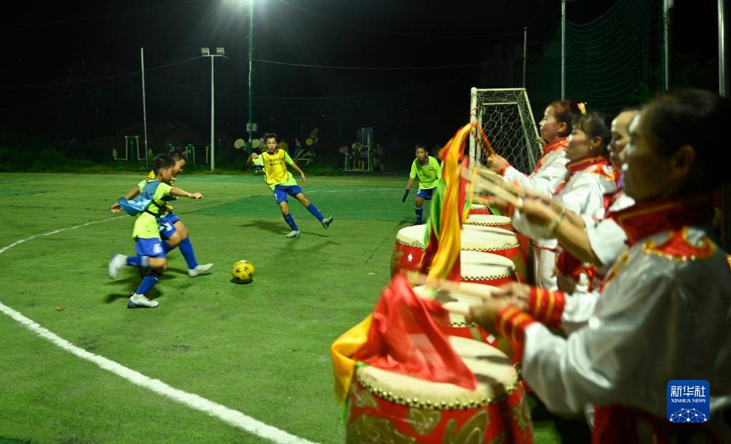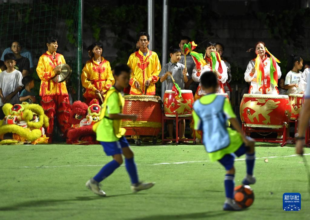 8月7日晚,村民敲鑼打鼓為參加足球賽的孩子們加油助威。