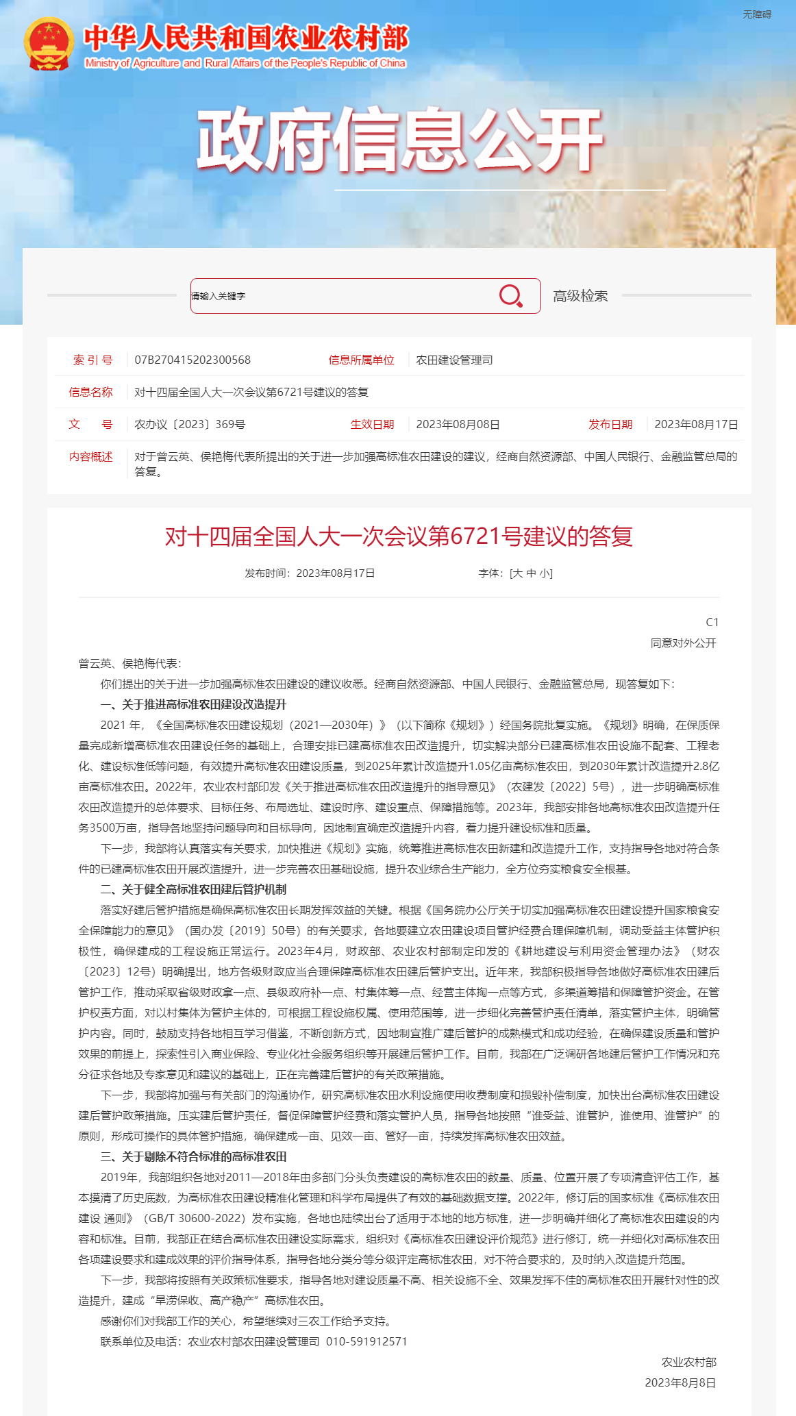 央視網(wǎng)消息:8月17日,農(nóng)業(yè)農(nóng)村部公布對十四屆全國人大一次會議第6721號建議的答復(fù)。其中提出,下一步,農(nóng)業(yè)農(nóng)村部將加強與有關(guān)部門的溝通協(xié)作,研究高標準農(nóng)田水利設(shè)施使用收費制度和損毀補償制度,加快出臺高標準農(nóng)田建設(shè)建后管護政策措施。壓實建后管護責(zé)任,督促保障管護經(jīng)費和落實管護人員,指導(dǎo)各地按照“誰受益、誰管護,誰使用、誰管護”的原則,形成可操作的具體管護措施,確保建成一畝、見效一畝、管好一畝,持續(xù)發(fā)揮高標準農(nóng)田效益。