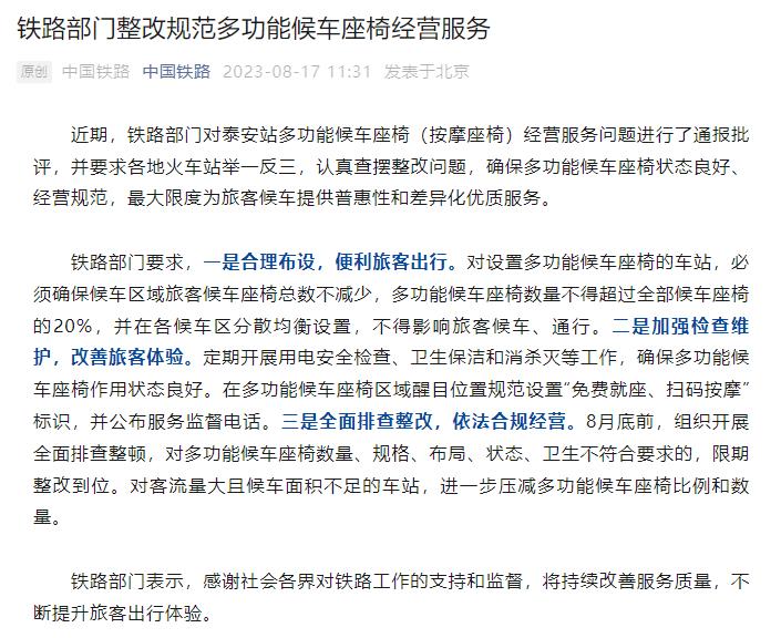 鐵路部門(mén)要求,一是合理布設(shè),便利旅客出行。對(duì)設(shè)置多功能候車(chē)座椅的車(chē)站,必須確保候車(chē)區(qū)域旅客候車(chē)座椅總數(shù)不減少,多功能候車(chē)座椅數(shù)量不得超過(guò)全部候車(chē)座椅的20%,并在各候車(chē)區(qū)分散均衡設(shè)置,不得影響旅客候車(chē)、通行。二是加強(qiáng)檢查維護(hù),改善旅客體驗(yàn)。定期開(kāi)展用電安全檢查、衛(wèi)生保潔和消殺滅等工作,確保多功能候車(chē)座椅作用狀態(tài)良好。在多功能候車(chē)座椅區(qū)域醒目位置規(guī)范設(shè)置“免費(fèi)就座、掃碼按摩”標(biāo)識(shí),并公布服務(wù)監(jiān)督電話(huà)。三是全面排查整改,依法合規(guī)經(jīng)營(yíng)。8月底前,組織開(kāi)展全面排查整頓,對(duì)多功能候車(chē)座椅數(shù)量、規(guī)格、布局、狀態(tài)、衛(wèi)生不符合要求的,限期整改到位。對(duì)客流量大且候車(chē)面積不足的車(chē)站,進(jìn)一步壓減多功能候車(chē)座椅比例和數(shù)量。