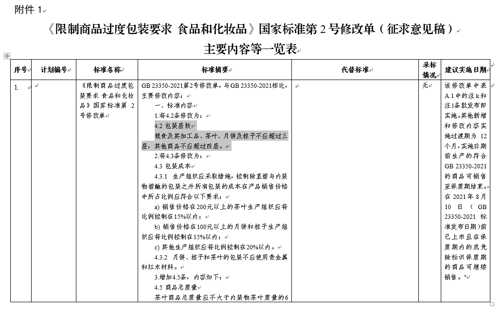 央視網(wǎng)消息:據(jù)工業(yè)和信息化部,根據(jù)國家標(biāo)準(zhǔn)委下達(dá)的強(qiáng)制性國家標(biāo)準(zhǔn)制修訂計(jì)劃,工業(yè)和信息化部組織完成了《限制商品過度包裝要求 食品和化妝品》強(qiáng)制性國家標(biāo)準(zhǔn)第2號修改單(征求意見稿)的編制工作。為進(jìn)一步聽取社會各界意見,現(xiàn)對標(biāo)準(zhǔn)征求意見稿及編制說明予以公示,截止日期2023年9月17日。