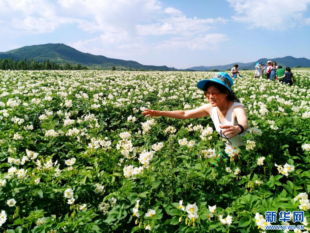 八月,青山環(huán)抱的黃土坡上,土豆花成團(tuán)成簇盛開(kāi),連成一片花海。