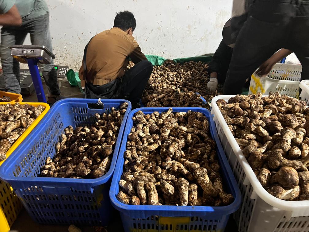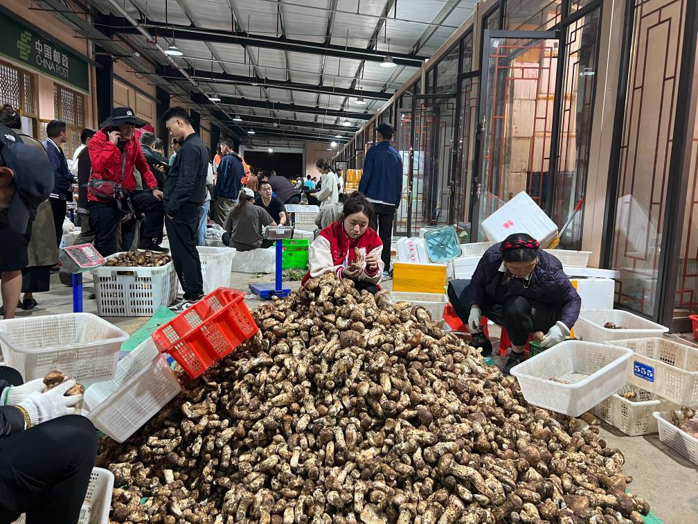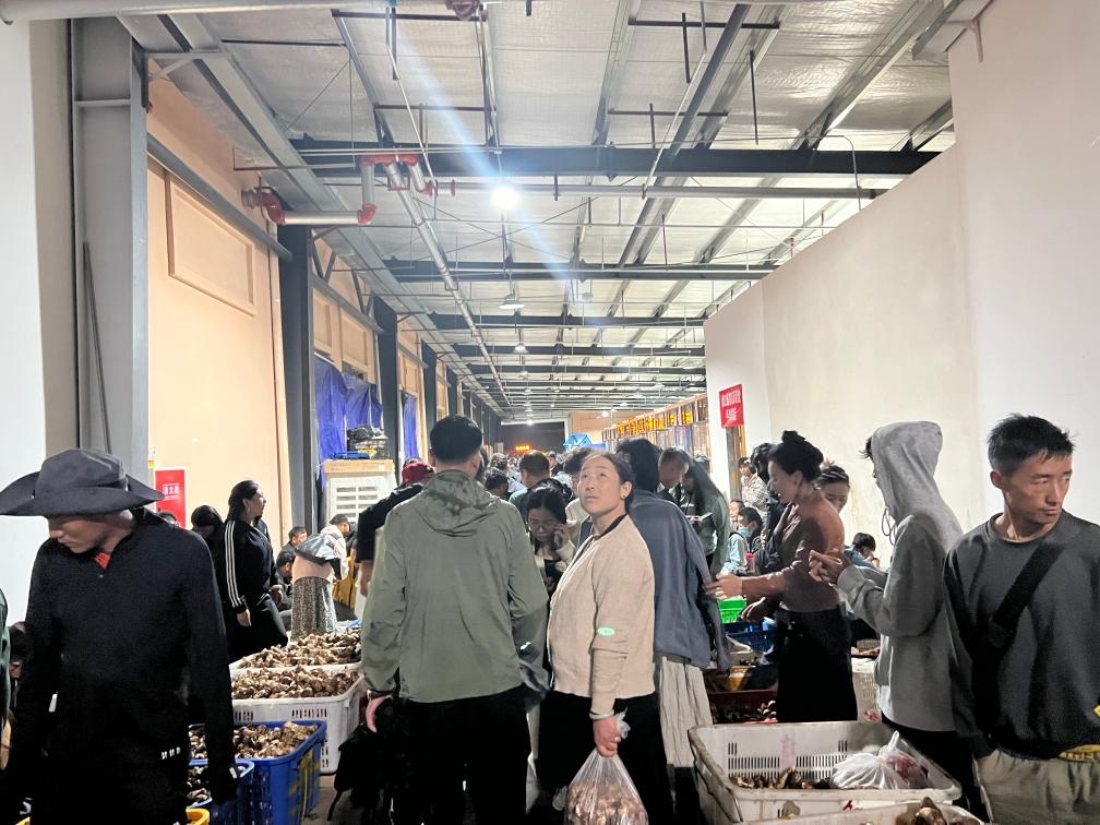 晚上11時(shí),記者走進(jìn)當(dāng)?shù)厮扇捉灰资袌?chǎng),看到客商云集,門(mén)店前滿(mǎn)是用松茸堆成的小山。雖已入夜,市場(chǎng)內(nèi)人聲鼎沸,商戶(hù)達(dá)瓦央宗熱情地拉住記者,推銷(xiāo)自家采摘的松茸。詢(xún)問(wèn)得知,這段時(shí)間,她和家人每天凌晨3點(diǎn)半摸黑出門(mén),沿著山道來(lái)到家附近的青杠林采摘新鮮松茸,然后來(lái)市場(chǎng)交易,有時(shí)一忙就要持續(xù)到深夜。“一個(gè)松茸季下來(lái),家里能增加五六萬(wàn)元的收入。”