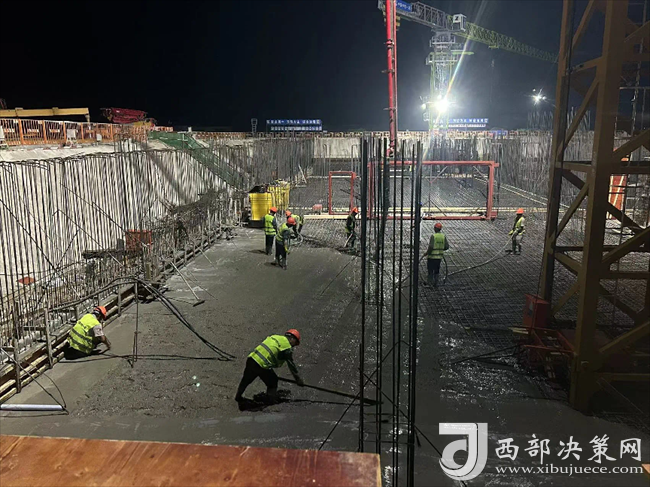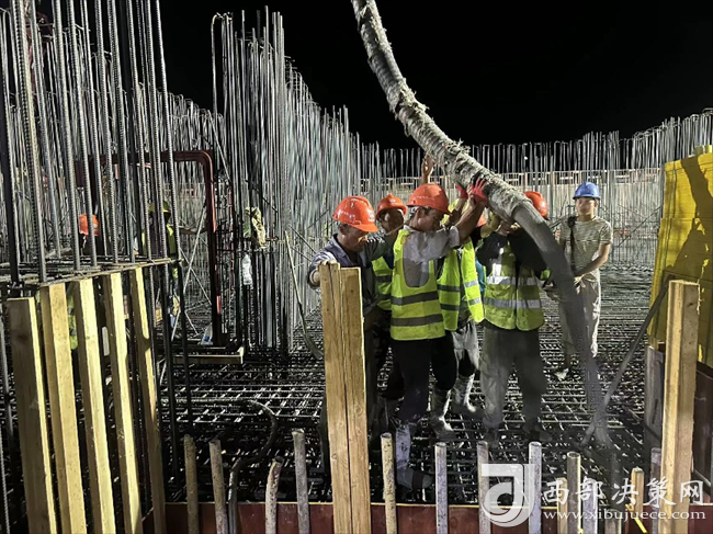 九層之臺(tái),始于壘土。筏板作為基礎(chǔ)工程最重要的組成部分,其質(zhì)量的好壞直接影響到上部結(jié)構(gòu)的穩(wěn)固性。在完成筏板鋼筋綁扎后,2臺(tái)長(zhǎng)臂泵車(chē)、34輛混凝土罐車(chē)開(kāi)始送料。澆筑期間,映入眼簾的是一片繁忙之景,22名管理人員,110余名勞務(wù)人員正以時(shí)不我待的緊迫感,全力以赴抓緊抓實(shí)項(xiàng)目建設(shè),共同助力項(xiàng)目建設(shè)跑出加速度。