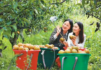 網(wǎng)紅主播在貴州省黔西市金碧鎮(zhèn)鏵口寨社區(qū)梨子基地,幫助村民直播銷售梨子。周訓(xùn)超攝(人民圖片)