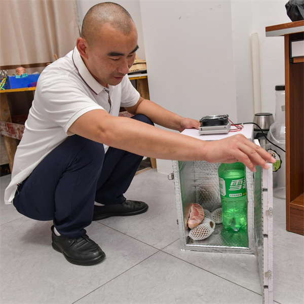 只有初中文憑的楊波就開始學(xué)習(xí)冰箱知識,了解冰箱原理結(jié)構(gòu):為什么會制冷還能調(diào)節(jié)溫度?等等,做到了了然于胸,又購買了冷卻片、制冷片、散熱片、風(fēng)扇、溫度計(jì)、封條等必備用料,自己又在工地找到了廢棄的塑膠板,在家具店里找來隔熱錫紙,經(jīng)過一番折騰,一臺高60 厘米、寬40厘米、厚40厘米的手工小冰箱做成功了。使用2個月來,最低溫度可達(dá)2攝氏度。效果非常好!