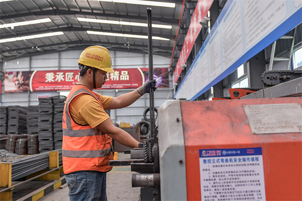 作為臨建標(biāo)準(zhǔn)化建設(shè)的重要標(biāo)志,桂鐘5、8標(biāo)段的鋼筋加工廠,廠房高度12米,作業(yè)場(chǎng)地平整、硬化。加工場(chǎng)內(nèi)醒目位置都設(shè)置工程公示牌、施工平面布置圖、安全生產(chǎn)牌、消防保衛(wèi)牌、管理人員名單及監(jiān)督電話牌、文明施工牌等明示標(biāo)志。加工廠內(nèi)按照功能設(shè)立了原材料堆放區(qū)、鋼筋下料區(qū)、加工制作區(qū)、鋼筋籠預(yù)拼接區(qū)、半成品堆放區(qū);還設(shè)置安裝了龍門數(shù)控切割機(jī)、全自動(dòng)數(shù)控液壓鋼筋調(diào)直切斷機(jī)、鋼筋快速鋸床、數(shù)控鋼筋彎曲機(jī)、數(shù)控鋼筋調(diào)直機(jī)、數(shù)控鋼筋彎箍機(jī)、數(shù)字化工業(yè)焊接機(jī)器人、數(shù)控滾籠焊機(jī)、數(shù)控立式彎曲中心、全自動(dòng)數(shù)控彎箍機(jī)、鋸切套絲打磨生產(chǎn)線等等機(jī)械化、數(shù)字化設(shè)備并懸掛著機(jī)械操作安全規(guī)定公示牌和設(shè)備標(biāo)示牌。這些工裝工藝標(biāo)準(zhǔn)化為項(xiàng)目部標(biāo)準(zhǔn)化建設(shè)賦能。