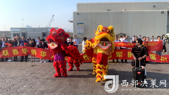 編隊海軍官兵跟各界人士,親切互動。阿聯(lián)酋龍城商會送上陜西彬州蘋果慰問子弟兵。